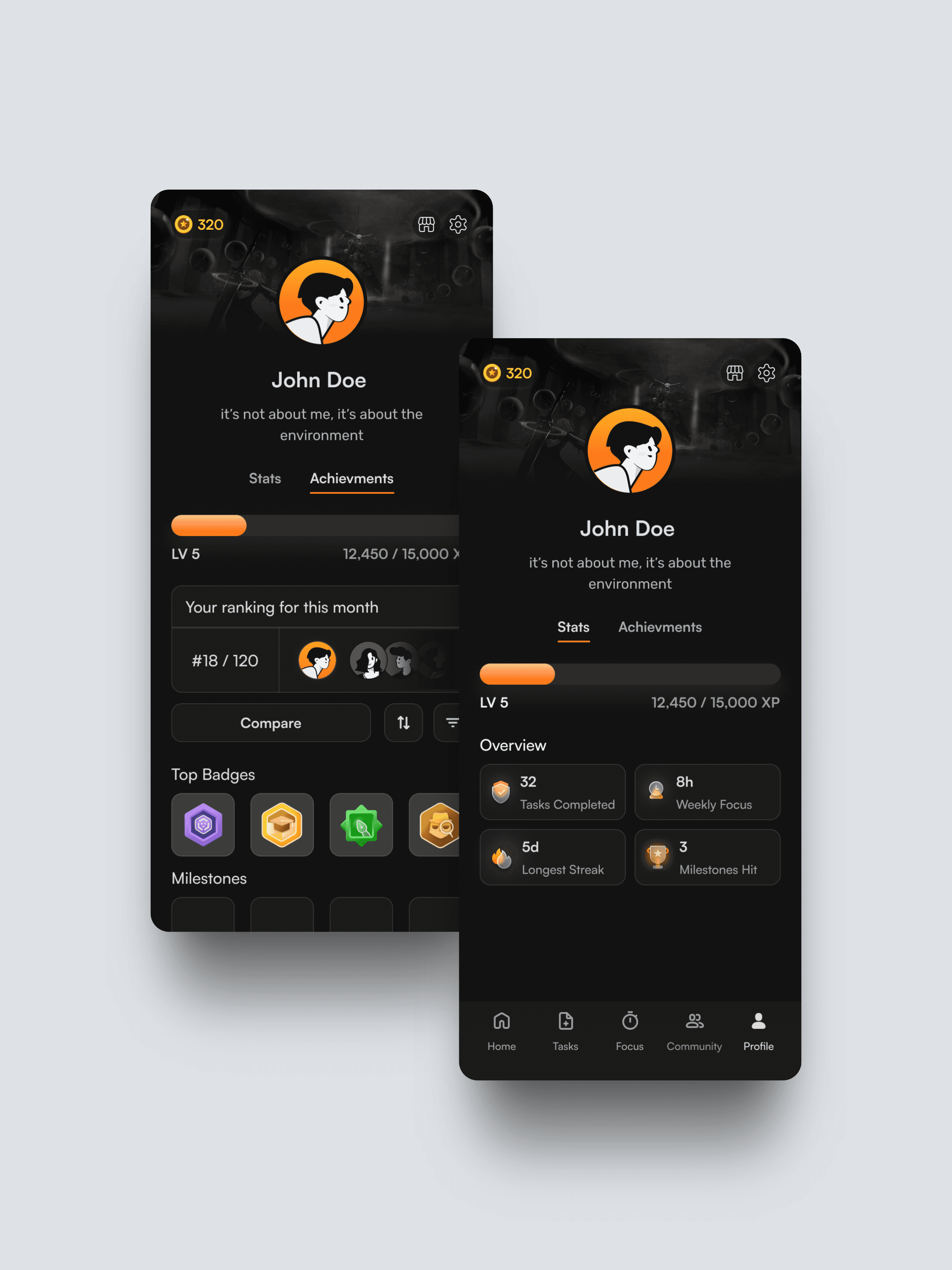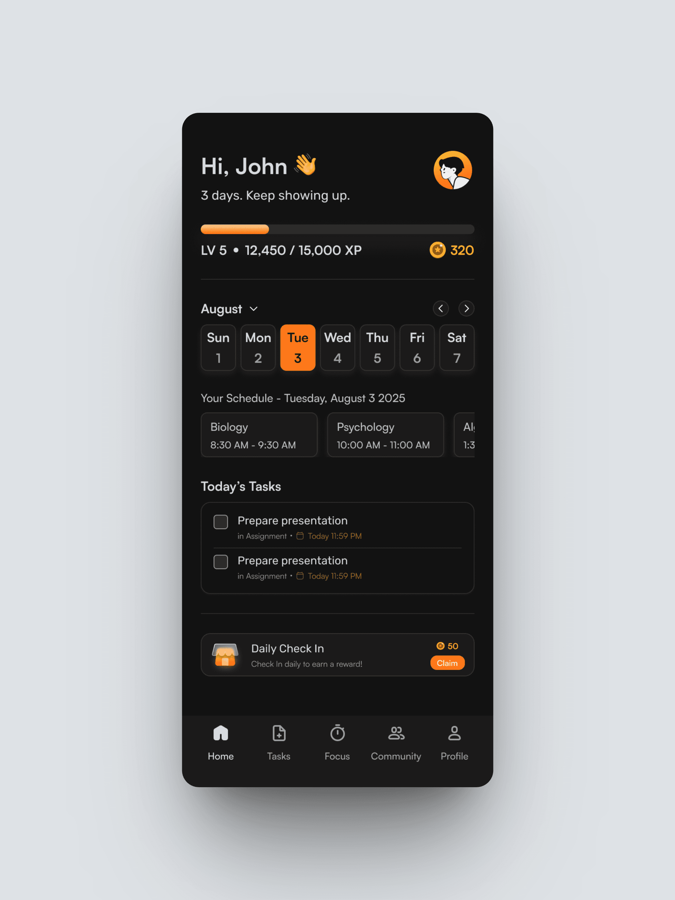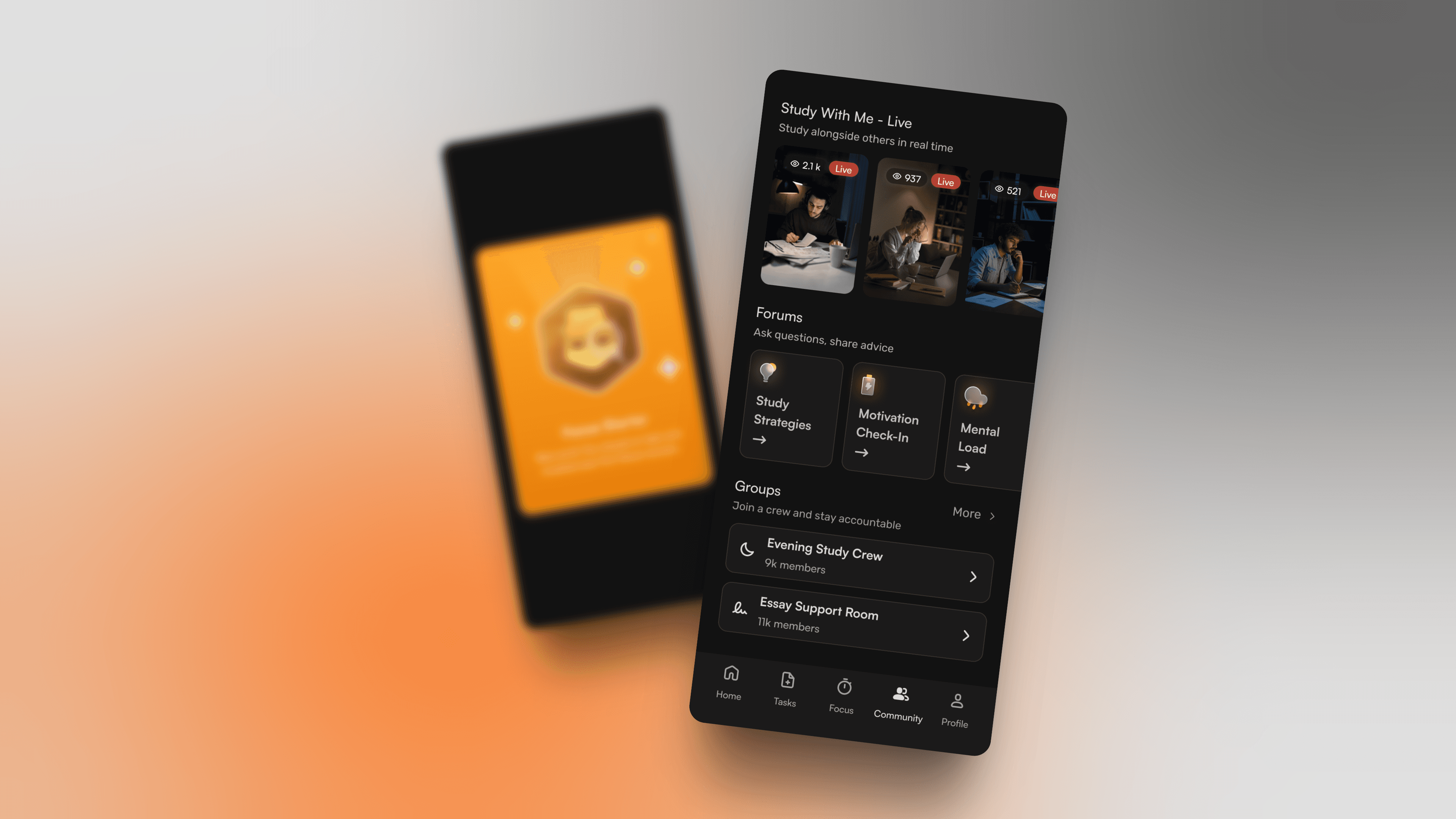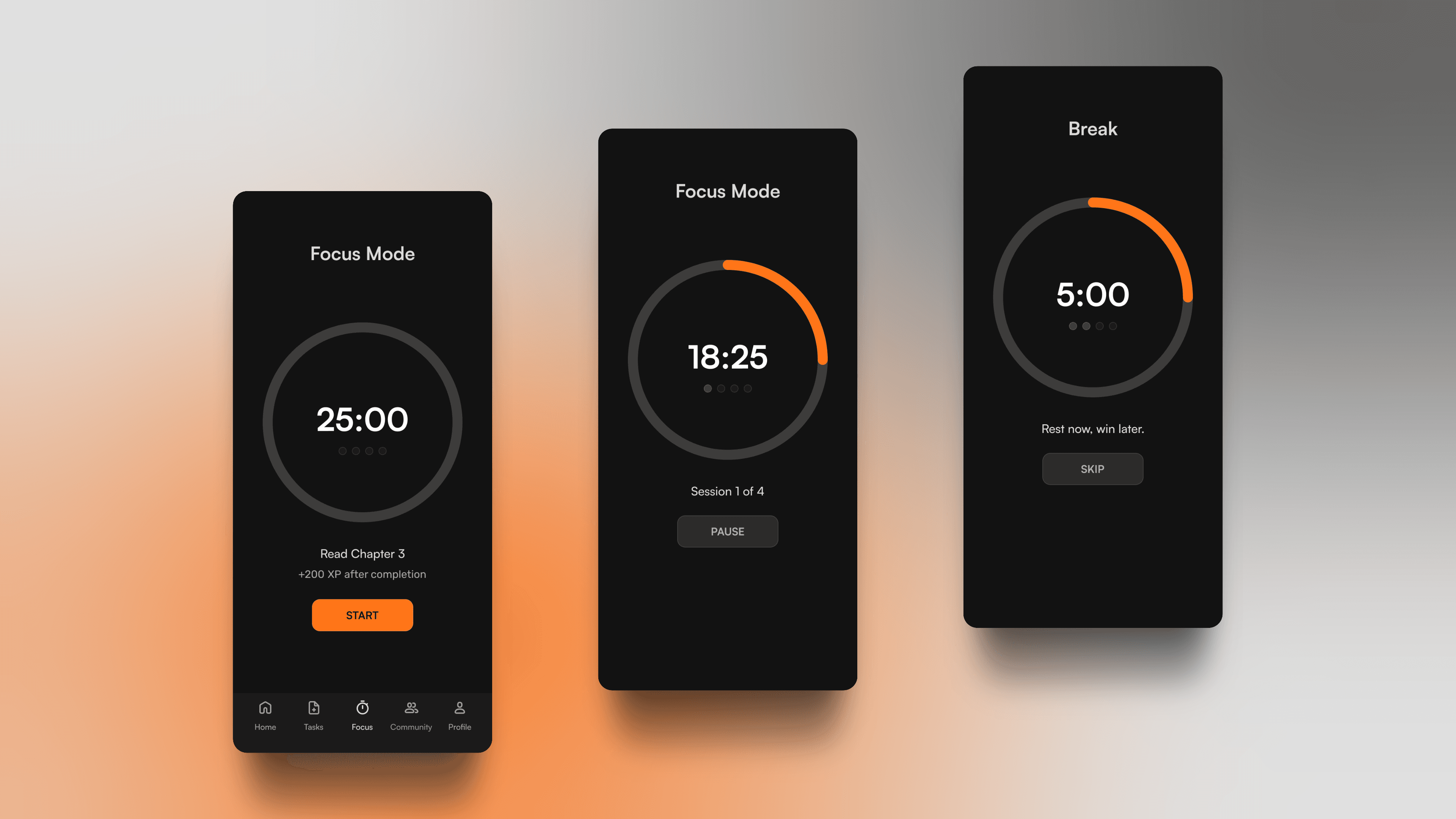 Scalable UI patterns and gamification mechanics were paired with academic task structure to reduce friction and reinforce momentum. A modular system was built to keep layouts predictable, with progression tied to tasks, streaks, XP, and VC rewards. Core flows were designed across onboarding, planning, focus mode, and community accountability, with decisions mapped to ADHD-informed UX patterns and accessibility best practices.