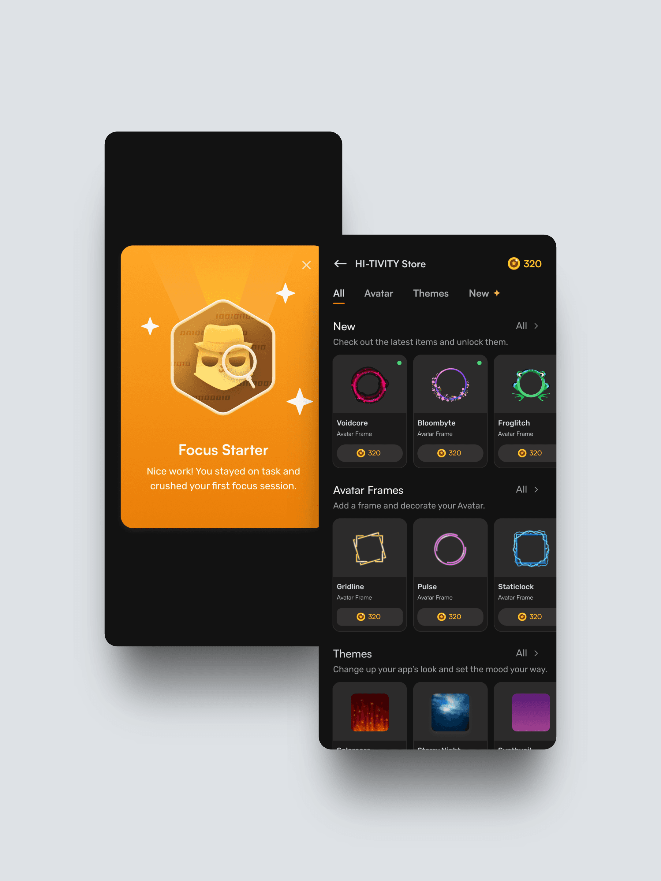 Delivers immediate feedback after focus sessions, reinforcing the loop with earned progress and VC rewards.